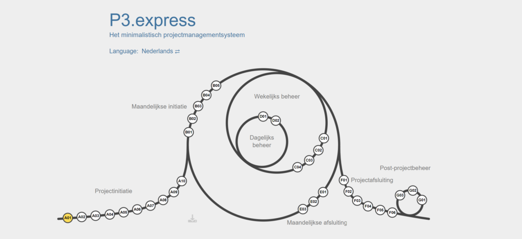 P3.express is een minimalistisch projectmanagementsysteem. Het onderscheidt zich van concurerende methodes zoals PRINCE2 en PMBOK door het toegankelijke ontwerp. Iedereen kan de methode leren en gebruiken. Het proces is intuitief, de producten zijn logisch en u hoeft geen kafkaesk jargon uit het hoofd te leren.